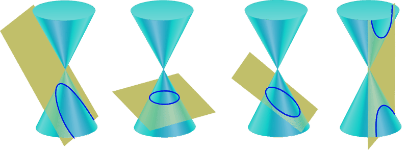 Two-dimensional subsets of a 3D (double) cone surface in which the shapes are determined by the intersection of a 2D plane