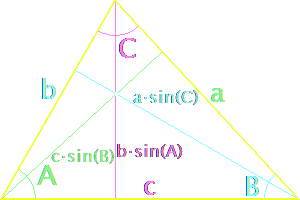 $$\frac{1}{2}·b·c·\sin(A)=\frac{1}{2}·c·a·\sin(B)=\frac{1}{2}·a·b·\sin(C)$$